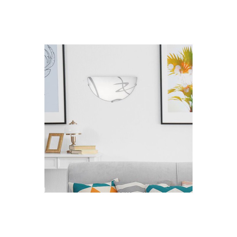 Štandard nástenné svietidlo soley. Odporúčaná miestnosť pre použitie je obývačka, spálňa, pracovná izba. Farba lampy biela. Farba tienidla biela vzorovaná. Materiál lampy kovové/ umelá hmota. Materiál tienidla sklo