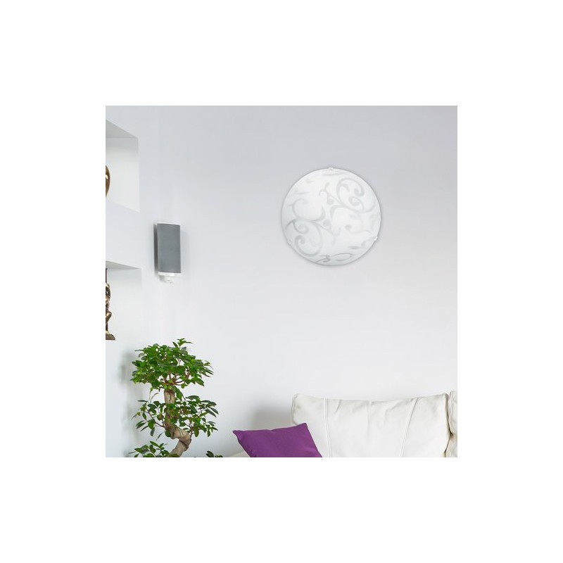 Štandard stropné svietidlo scroll. Odporúčaná miestnosť pre použitie je obývačka, pracovná izba. Farba lampy biela. Farba tienidla priehľadná. Materiál lampy kovové/ umelá hmota. Materiál tienidla sklo