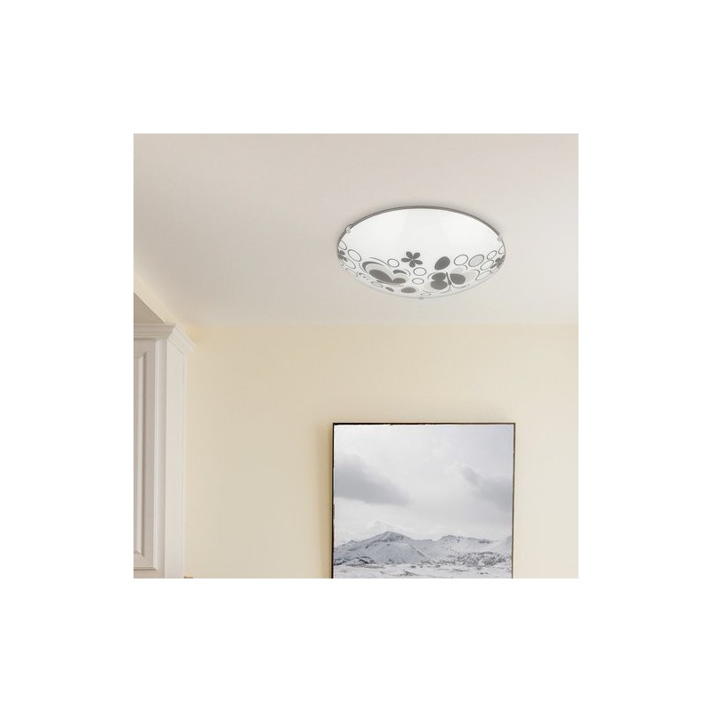 Štandard stropné svietidlo irina. Odporúčaná miestnosť pre použitie je obývačka, pracovná izba. Farba lampy viacfarebná. Farba tienidla biela vzorovaná. Materiál lampy kovové/ umelá hmota. Materiál tienidla sklo