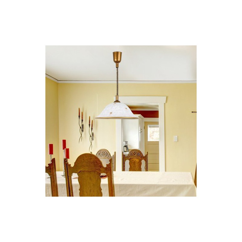Klasické závesné svietidlo art flower. Odporúčaná miestnosť pre použitie je obývačka, kuchyňa, jedáleň, spálňa. Farba lampy biele alabastrové sklo. Farba tienidla biela vzorovaná. Materiál lampy umelá hmota. Materiál tienidla sklo