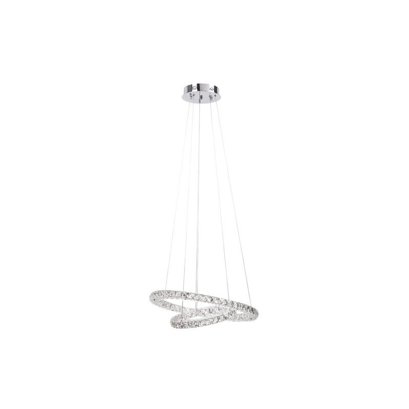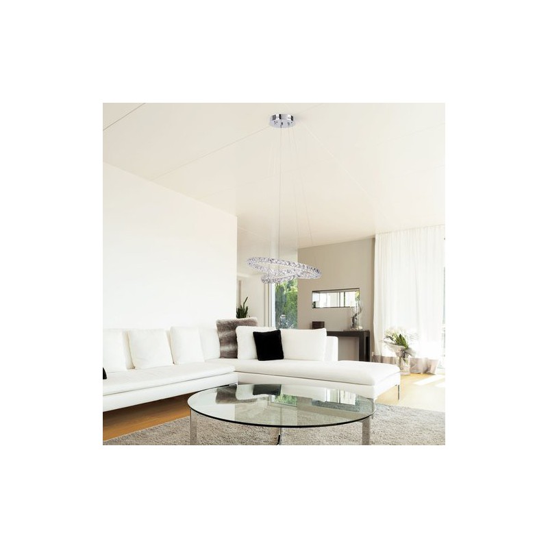 Moderné závesné svietidlo carrie. Odporúčaná miestnosť pre použitie je obývačka, jedáleň. Farba lampy chrómová. Farba tienidla priesvitný krištáľ. Materiál lampy kovové. Materiál tienidla sklo krištál'