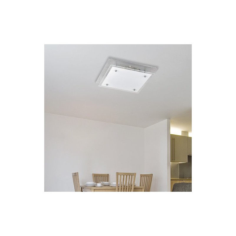 Moderné stropné svietidlo june. Odporúčaná miestnosť pre použitie je obývačka, pracovná izba. Farba lampy strieborná fólia. Farba tienidla biela. Materiál lampy kovové. Materiál tienidla sklo