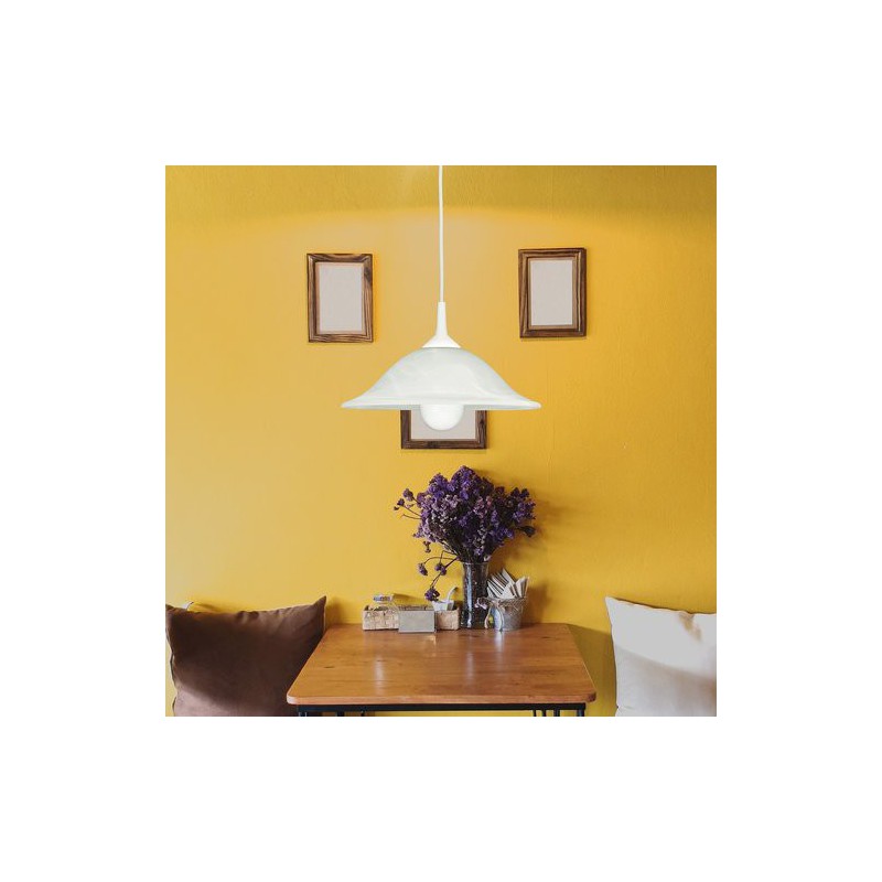 Štandard závesné svietidlo alabastro. Odporúčaná miestnosť pre použitie je obývačka, spálňa, pracovná izba. Farba lampy biele alabastrové sklo. Farba tienidla biele alabastrové sklo. Materiál lampy umelá hmota. Materiál tienidla sklo