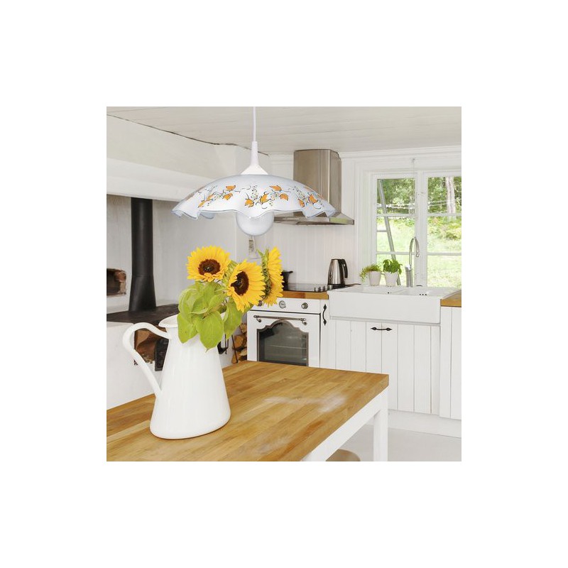 Klasické závesné svietidlo vino. Odporúčaná miestnosť pre použitie je obývačka, jedáleň, kuchyňa. Farba lampy biela. Farba tienidla biela vzorovaná. Materiál lampy umelá hmota. Materiál tienidla sklo