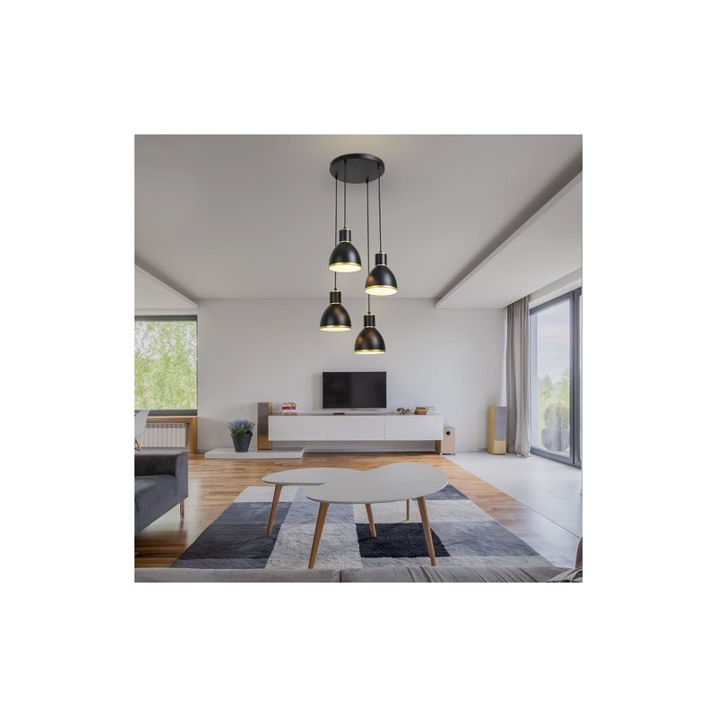 Industriálny závesné svietidlo mackenzie. Odporúčaná miestnosť pre použitie je obývačka. Farba lampy čierna. Farba tienidla zlatá. Materiál lampy kovové. Materiál tienidla kovové