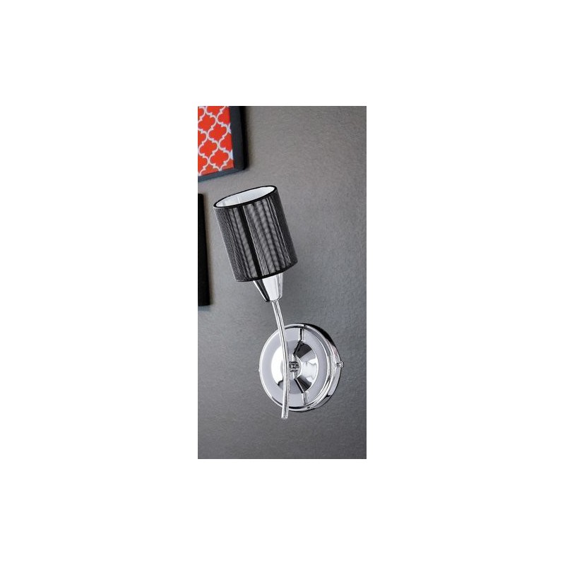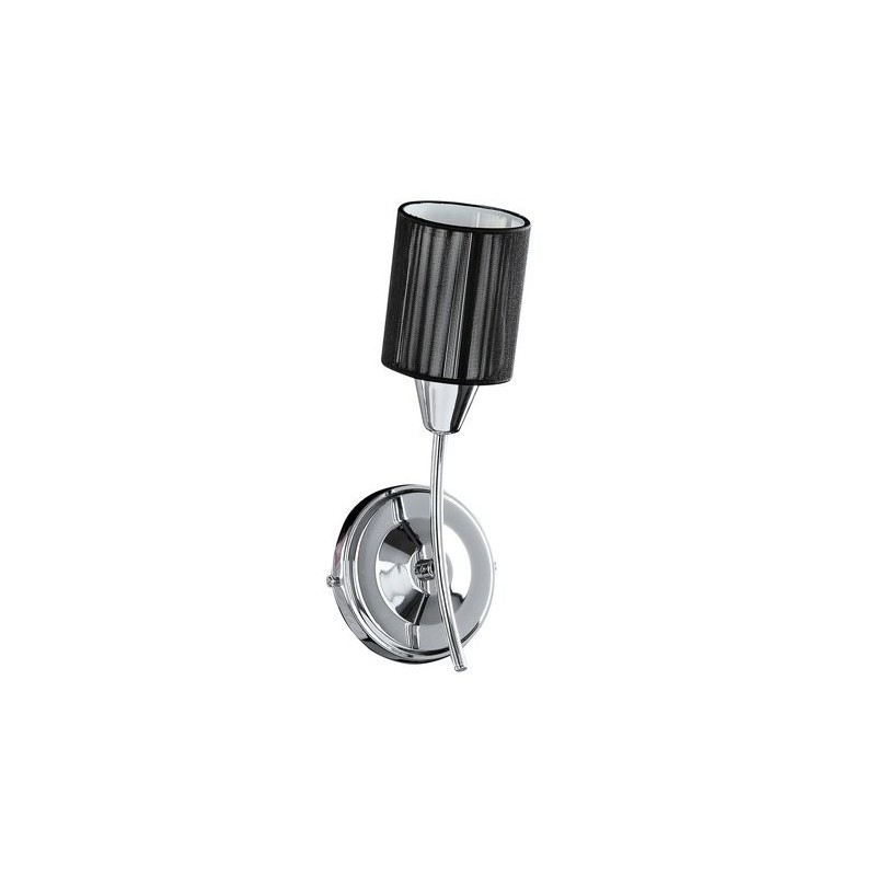 Štandard nástenné svietidlo veda. Odporúčaná miestnosť pre použitie je obývačka, spálňa, pracovná izba. Farba lampy chrómová. Farba tienidla čierna. Materiál lampy kovové. Materiál tienidla textil