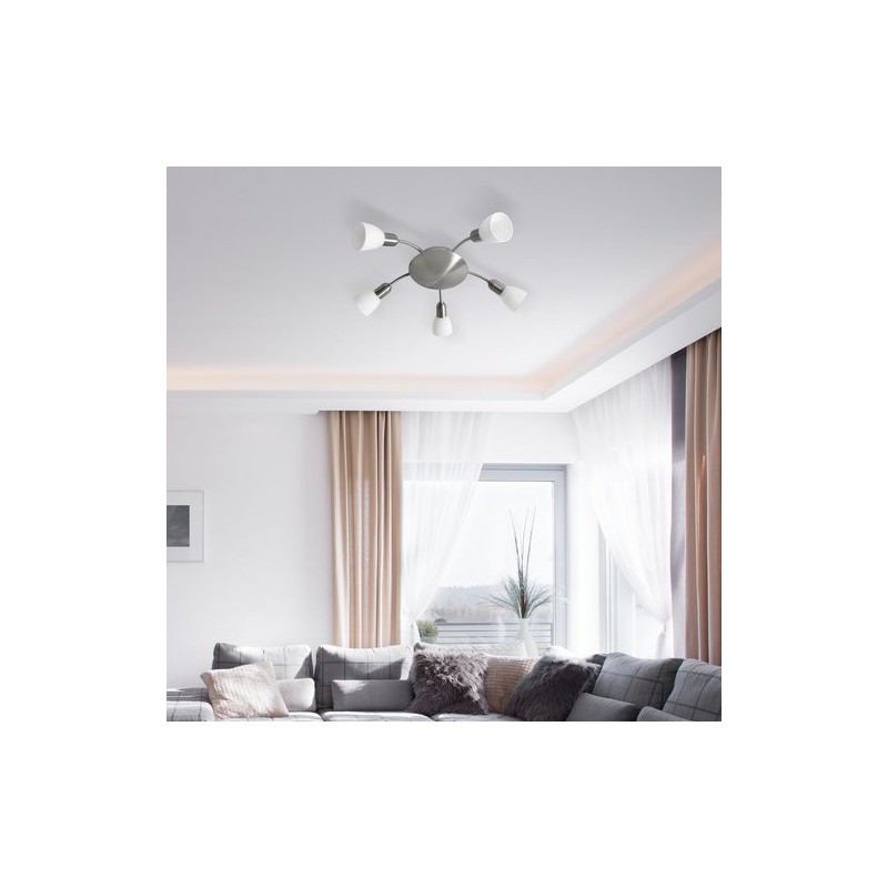 Štandard stropné svietidlo soma. Odporúčaná miestnosť pre použitie je obývačka, spálňa, pracovná izba. Farba lampy saténová chrómová. Farba tienidla biela. Materiál lampy kovové. Materiál tienidla sklo