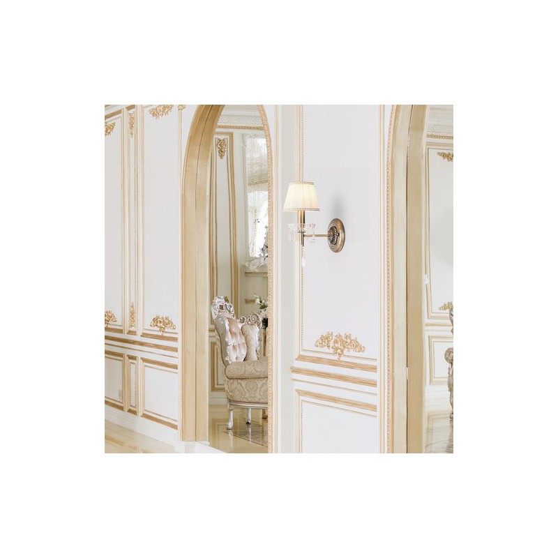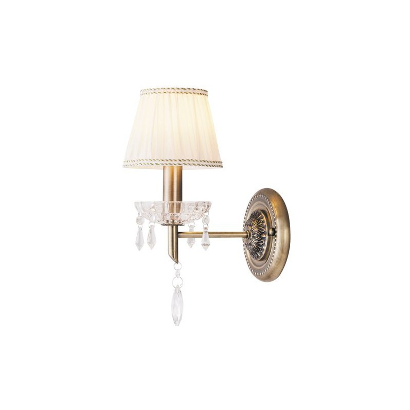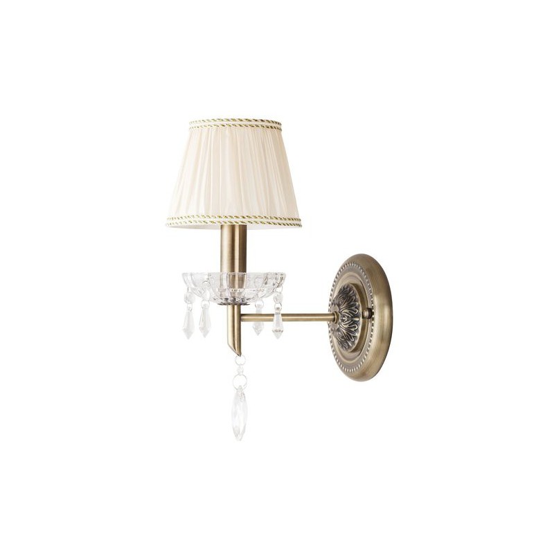 Klasické nástenné svietidlo claudia. Odporúčaná miestnosť pre použitie je obývačka, jedáleň, spálňa. Farba lampy bronzová. Farba tienidla biela. Materiál lampy kovové/ sklo/ sklo krištál'. Materiál tienidla textil