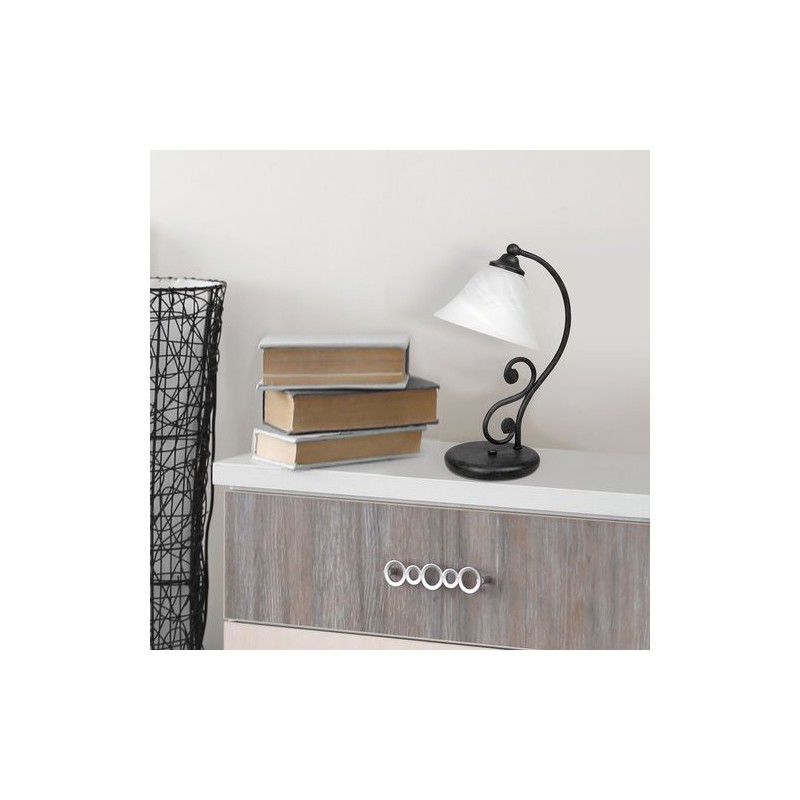 Mediteránsky nočná lampa dorothea. Odporúčaná miestnosť pre použitie je obývačka, pracovná izba. Farba lampy matná čierna. Farba tienidla biele alabastrové sklo. Materiál lampy kovové. Materiál tienidla sklo