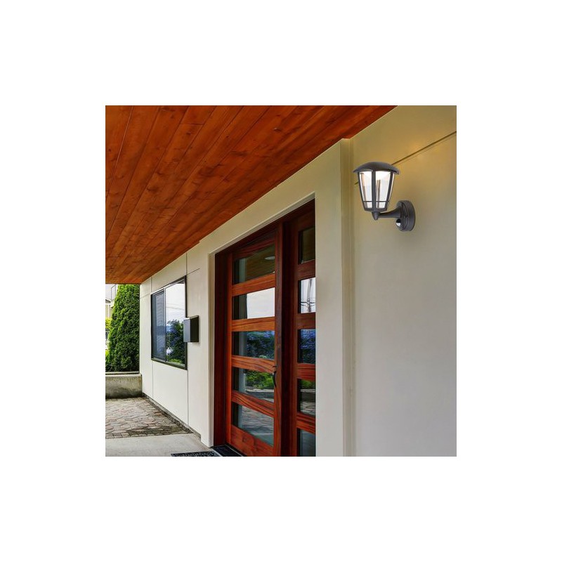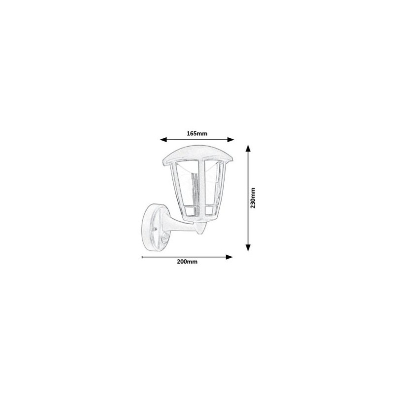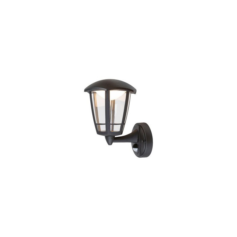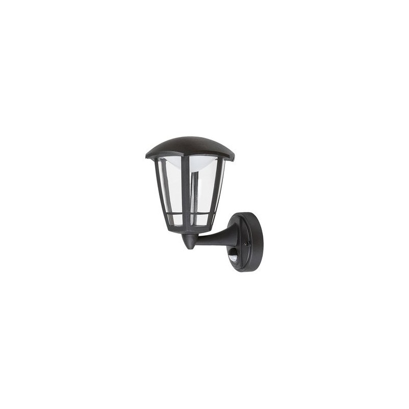 Klasické vonkajšie nástenné svietidlo sorrento. Odporúčaná miestnosť pre použitie je stena domu. So senzorom pohybu 8m, 120°. Farba lampy matná čierna. Farba tienidla priehľadná. Materiál lampy umelá hmota. Materiál tienidla umelá hmota