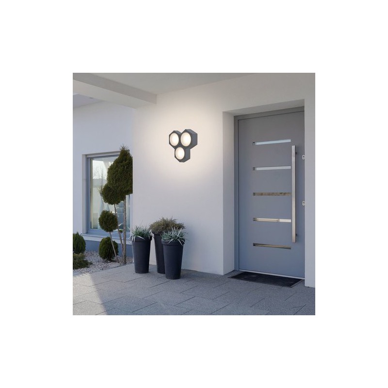 Moderné vonkajšie nástenné svietidlo avola. Odporúčaná miestnosť pre použitie je stena domu. Farba lampy antracit. Materiál lampy kovové. Materiál tienidla sklo