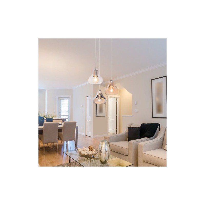 Moderné závesné svietidlo jezabel. Odporúčaná miestnosť pre použitie je obývačka. Farba lampy chrómová. Farba tienidla dymová. Materiál lampy kovové. Materiál tienidla sklo
