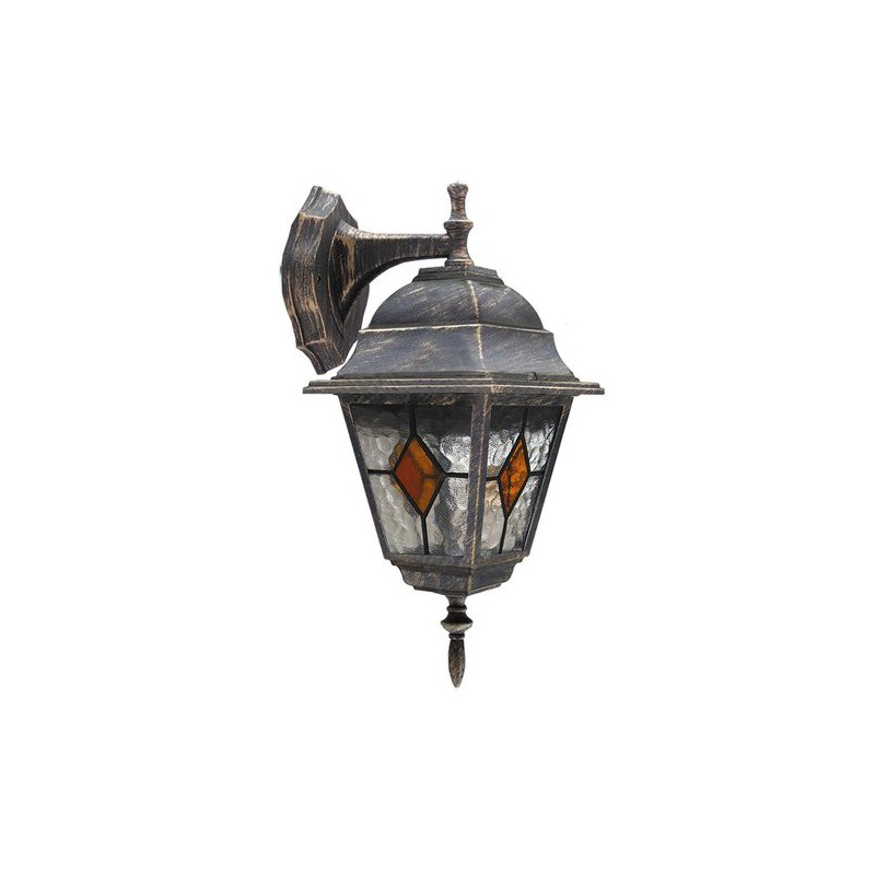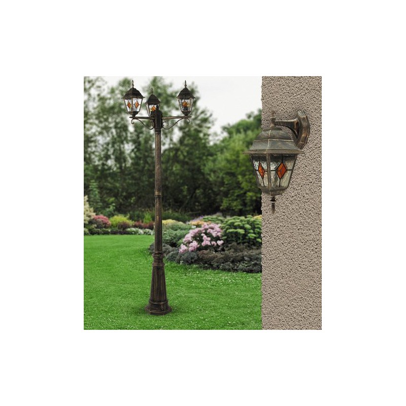 Klasické vonkajšie nástenné svietidlo monaco. Odporúčaná miestnosť pre použitie je terasa, stena domu. Farba lampy antická zlatá. Farba tienidla viacfarebná. Materiál lampy kovové. Materiál tienidla sklo