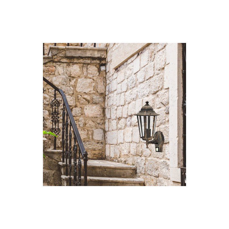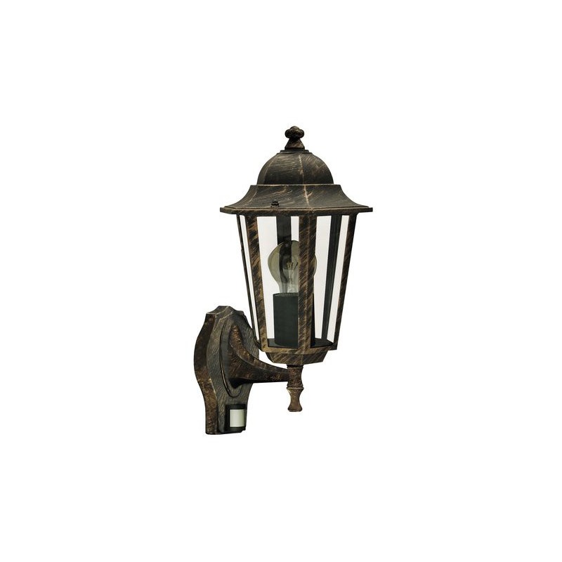 Klasické vonkajšie nástenné svietidlo velence. Odporúčaná miestnosť pre použitie je terasa, stena domu. So senzorom pohybu 8m, 120°. Farba lampy antická zlatá. Farba tienidla priehľadná. Materiál lampy kovové. Materiál tienidla sklo
