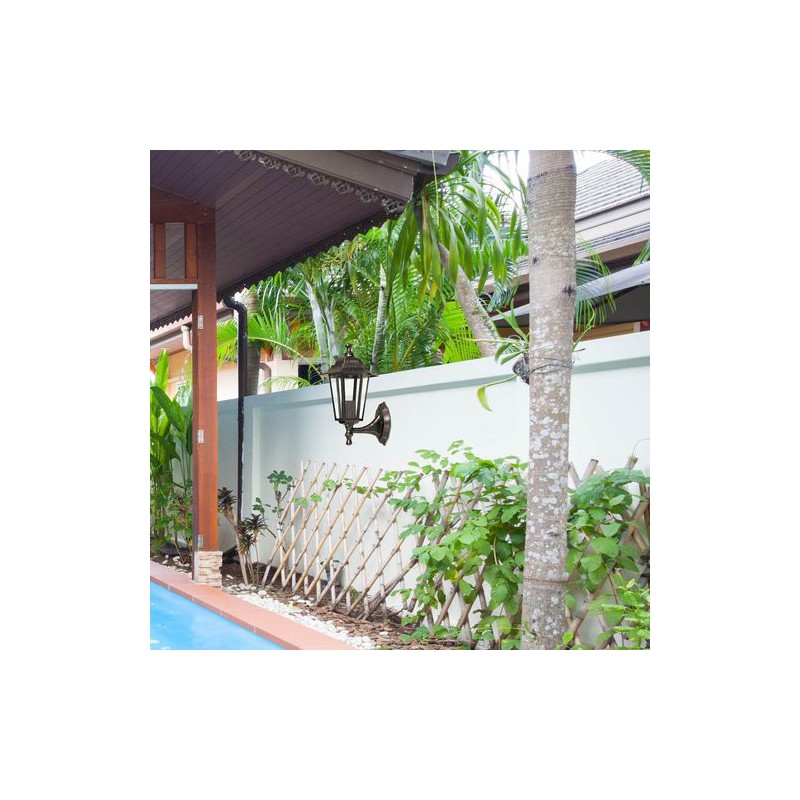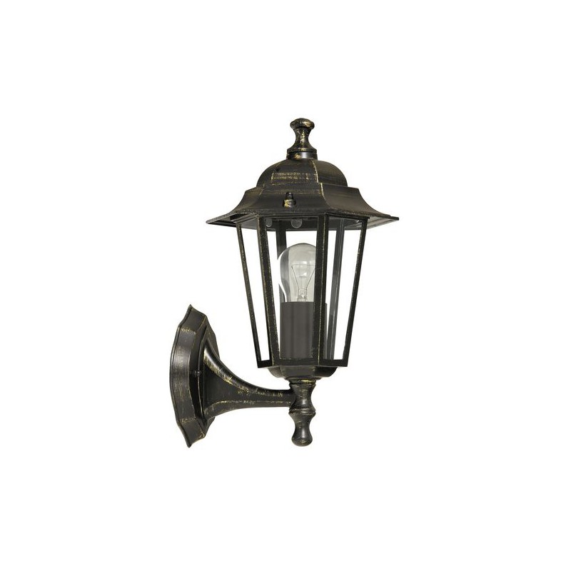 Klasické vonkajšie nástenné svietidlo velence. Odporúčaná miestnosť pre použitie je terasa, stena domu. Farba lampy antická zlatá. Farba tienidla priehľadná. Materiál lampy kovové. Materiál tienidla sklo