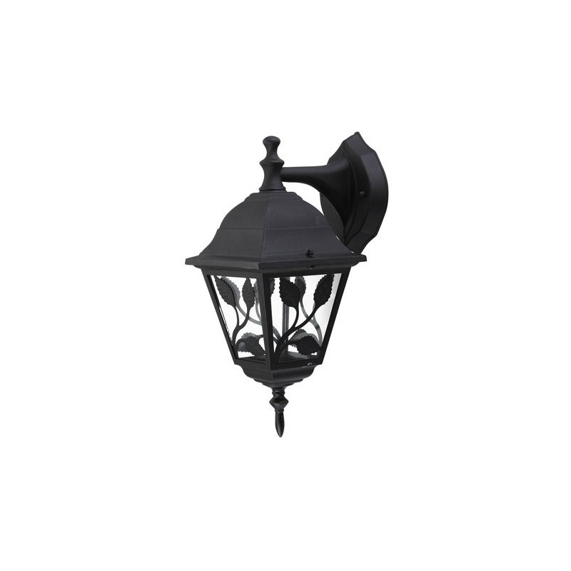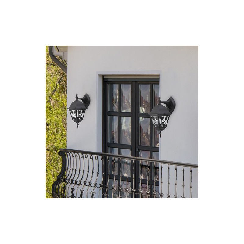 Klasické vonkajšie nástenné svietidlo haga. Odporúčaná miestnosť pre použitie je terasa, stena domu. Farba lampy čierna. Farba tienidla priehľadná. Materiál lampy kovové. Materiál tienidla sklo
