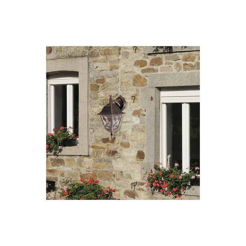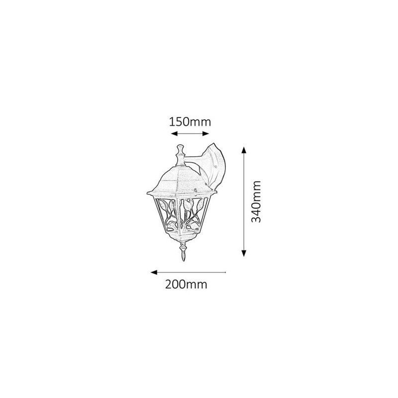 Klasické vonkajšie nástenné svietidlo haga. Odporúčaná miestnosť pre použitie je terasa, stena domu. Farba lampy antická zlatá. Farba tienidla priehľadná. Materiál lampy kovové. Materiál tienidla sklo