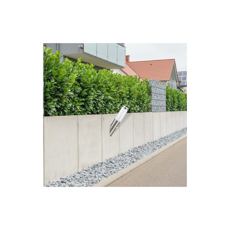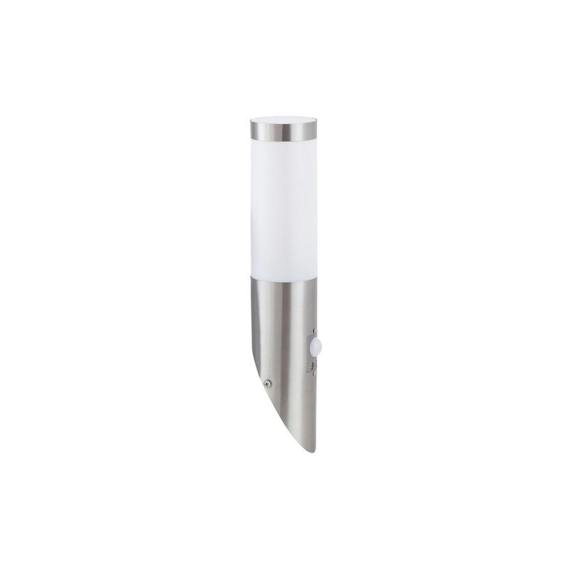 Moderné vonkajšie nástenné svietidlo inox torch. Odporúčaná miestnosť pre použitie je terasa, stena domu. So senzorom pohybu 5m, 100°. Farba lampy nehrdzavejúca ocel. Farba tienidla biela. Materiál lampy kovové. Materiál tienidla umelá hmota