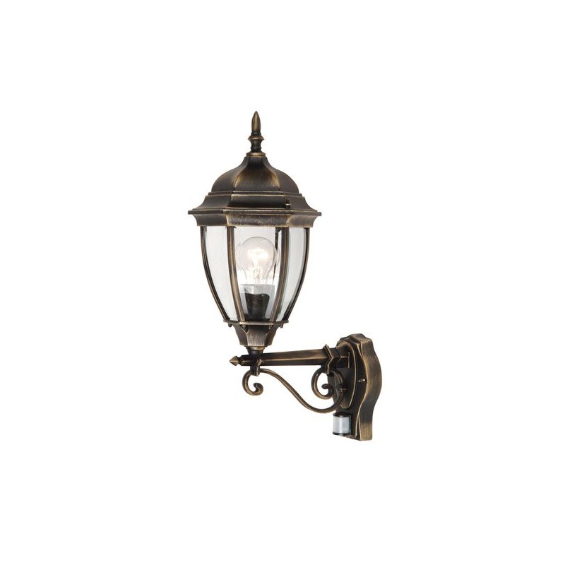 Klasické vonkajšie nástenné svietidlo toronto. Odporúčaná miestnosť pre použitie je terasa, stena domu. So senzorom pohybu 8m, 100°. Farba lampy antická zlatá. Farba tienidla priehľadná. Materiál lampy kovové. Materiál tienidla sklo
