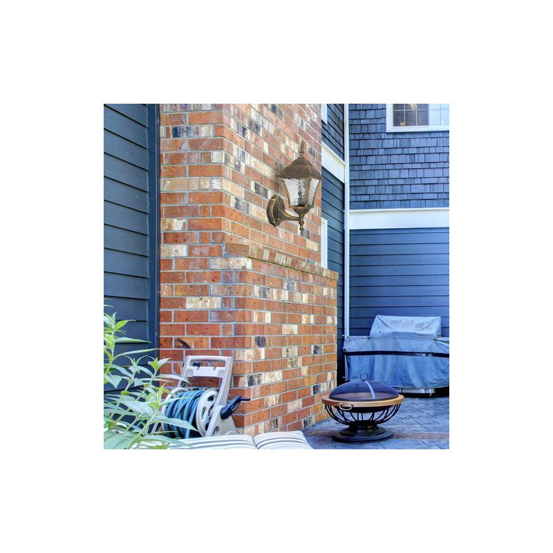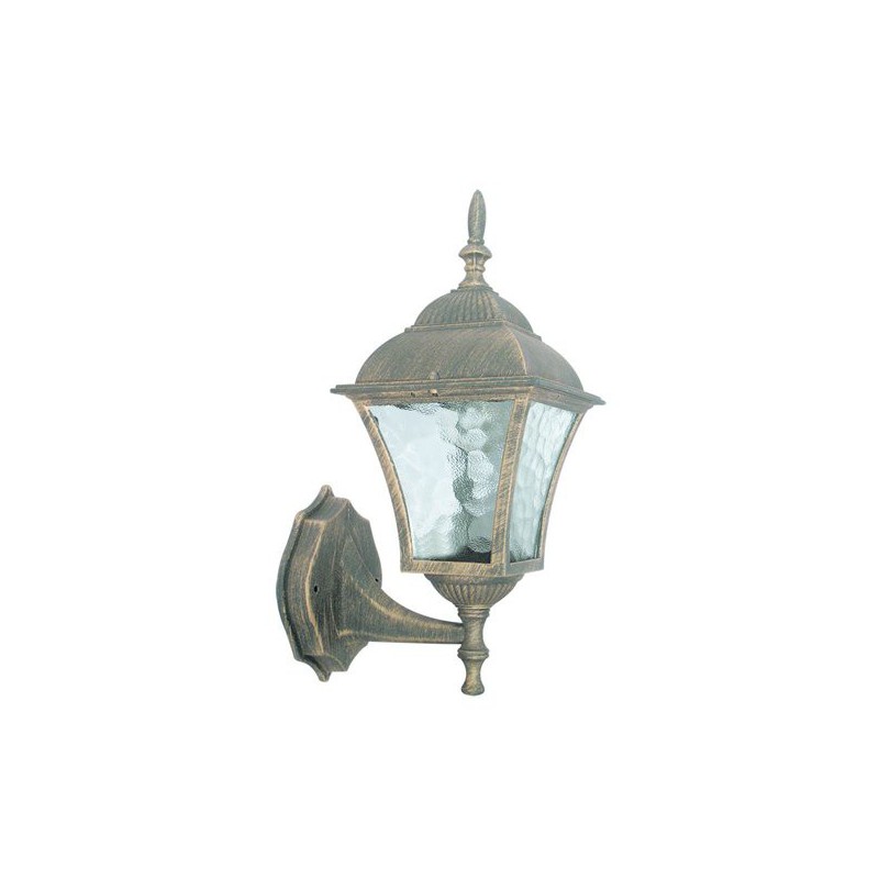 Klasické vonkajšie nástenné svietidlo toscana. Odporúčaná miestnosť pre použitie je terasa, stena domu. Farba lampy antická zlatá. Farba tienidla priehľadná. Materiál lampy kovové. Materiál tienidla sklo