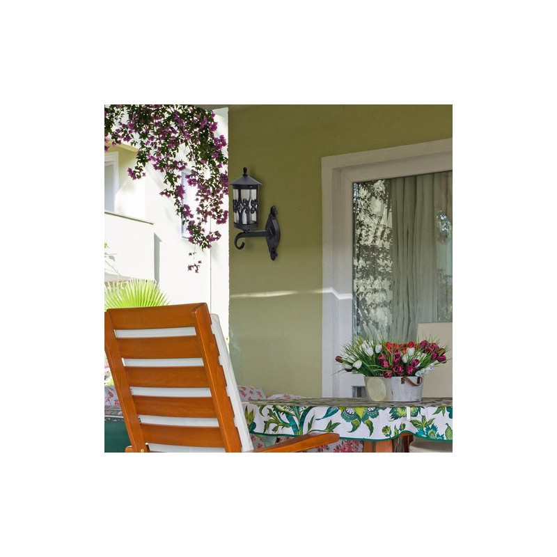 Mediteránsky vonkajšie nástenné svietidlo palma. Odporúčaná miestnosť pre použitie je terasa, stena domu. Farba lampy čierna. Farba tienidla priehľadná. Materiál lampy kovové. Materiál tienidla sklo