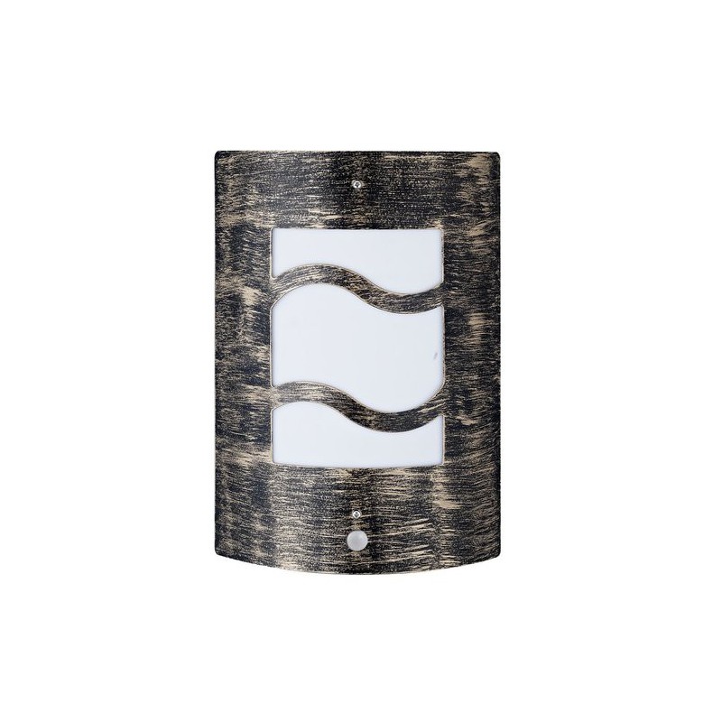 Moderné vonkajšie nástenné svietidlo denver 4. Odporúčaná miestnosť pre použitie je terasa, stena domu. So senzorom pohybu 8m, 120°. Farba lampy antická zlatá. Farba tienidla biela. Materiál lampy kovové/ umelá hmota. Materiál tienidla umelá hmota