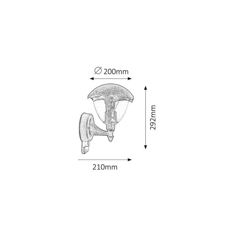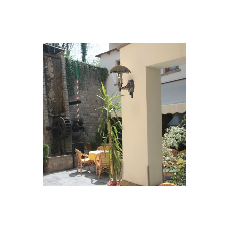 Klasické vonkajšie nástenné svietidlo miami. Odporúčaná miestnosť pre použitie je terasa, stena domu. So senzorom pohybu 0,5-12m, 140°. Farba lampy antická zlatá. Farba tienidla priehľadná. Materiál lampy kovové. Materiál tienidla umelá hmota