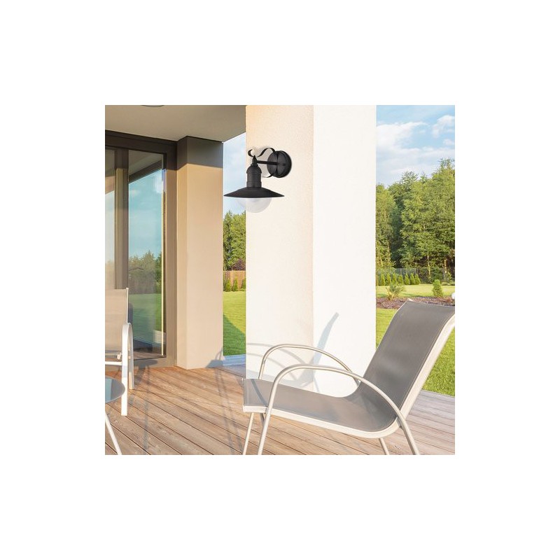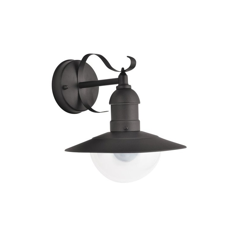 Mediteránsky vonkajšie nástenné svietidlo oslo. Odporúčaná miestnosť pre použitie je terasa, stena domu. Farba lampy čierna. Farba tienidla priehľadná. Materiál lampy kovové. Materiál tienidla umelá hmota