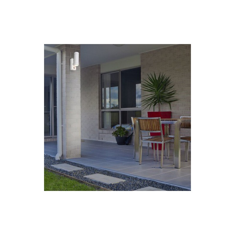 Minimalistický vonkajšie nástenné svietidlo medina. Odporúčaná miestnosť pre použitie je stena domu. So senzorom pohybu 2-8m, 90°. Farba lampy matná biela. Materiál lampy umelá hmota. Materiál tienidla umelá hmota