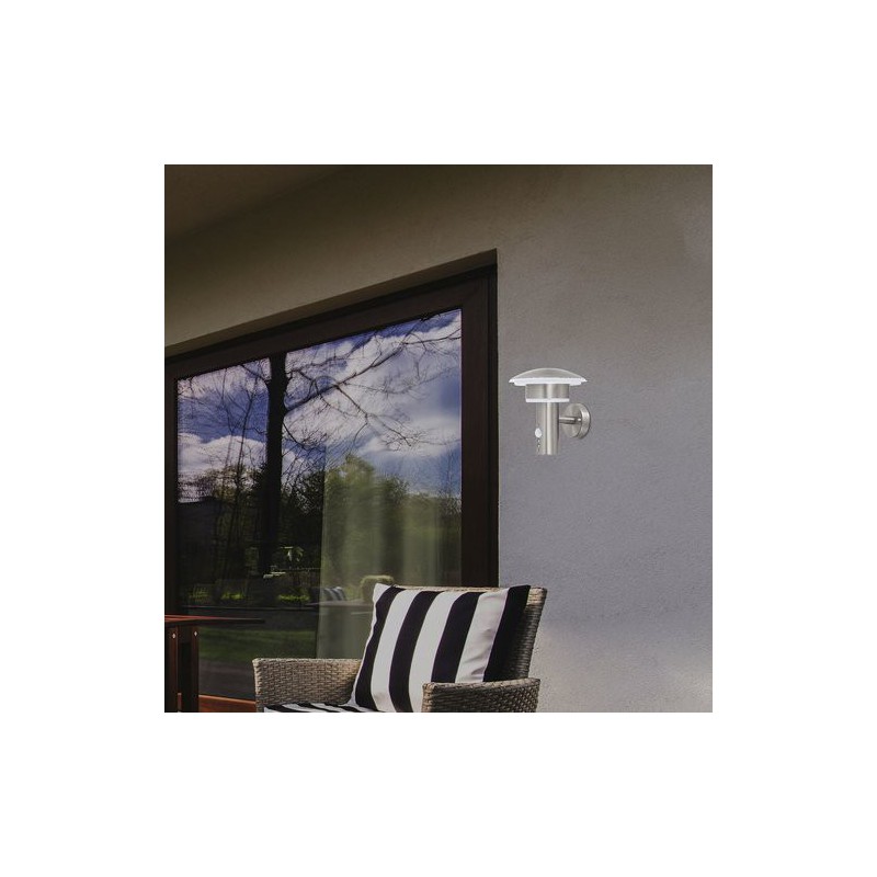 Moderné vonkajšie nástenné svietidlo denmark. Odporúčaná miestnosť pre použitie je stena domu. So senzorom pohybu 2-8m, 90°. Farba lampy nehrdzavejúca ocel. Farba tienidla opálové sklo. Materiál lampy kovové. Materiál tienidla umelá hmota